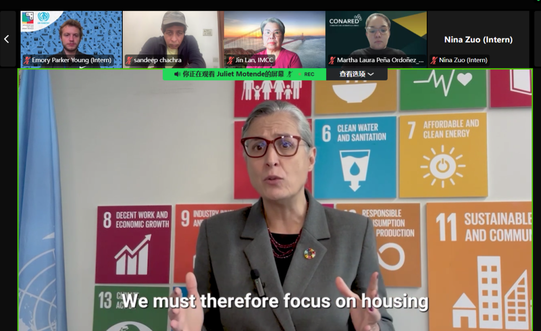 UN Under-Secretary-General and UN-Habitat Executive Director Anacláudia Rossbach delivers a video address at the meeting. Jin Lan, founder of the IMCC and the second chairperson of the Open Green City Laboratory (OGCLab), is third from the left at the top.
