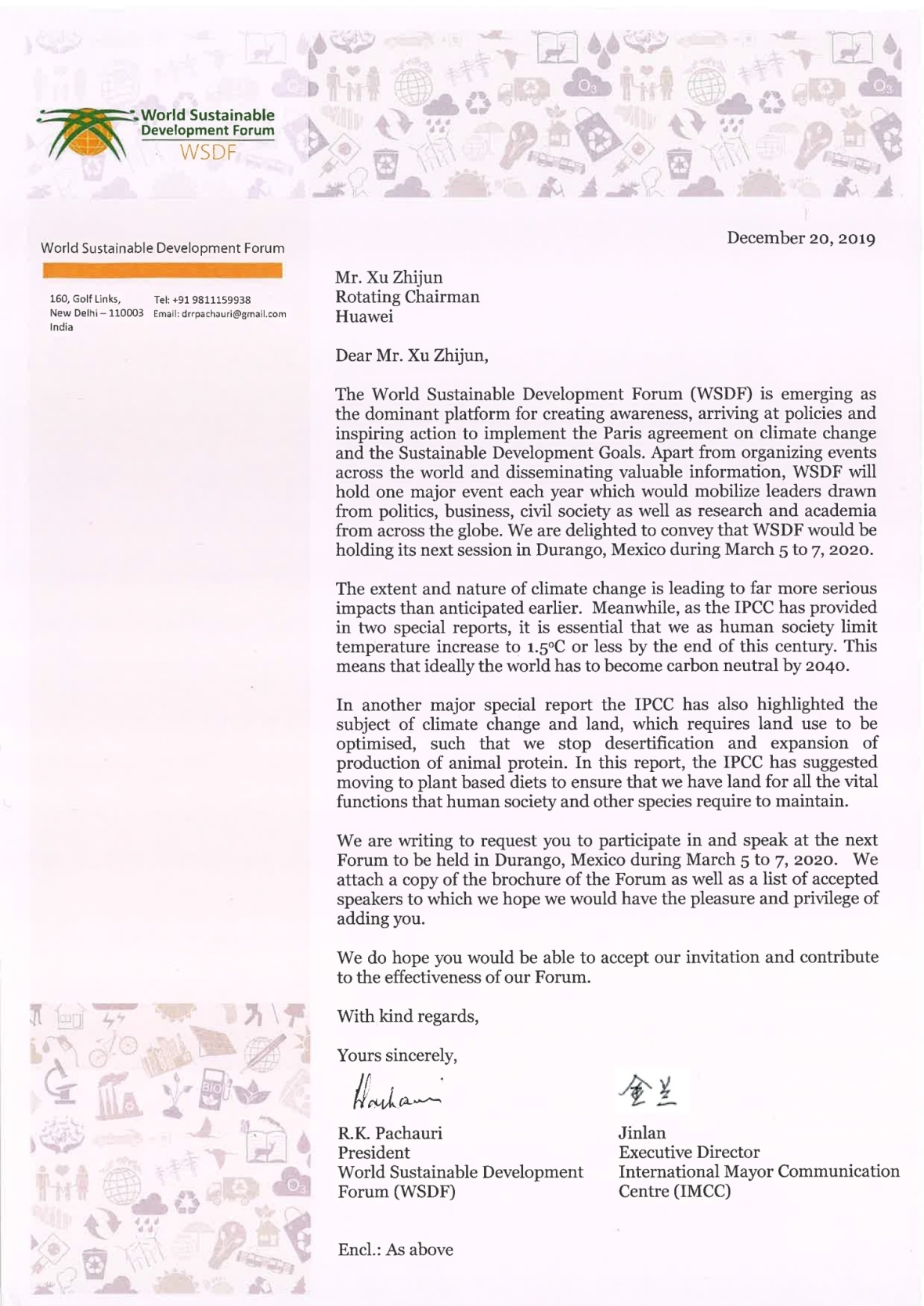 我回想起,2019年夏季,您的身体在向好的方面恢复,您就雄心勃勃地在筹备2020年3月在墨西哥杜兰戈举办的第二届“世界可持续发展论坛”,您那么诚恳地邀请华为轮值董事长徐直军先生作为演讲嘉宾去推广华为的社会责任文化。华为的行动正如您所望,在疫情阴霾笼罩全球时的第二届“世界可持续发展论坛”上,是他们赞助了远程会议设备,才保障了论坛在您离世15天后仍能让联合国前秘书长潘基文冲破疫情阻隔,在首尔家中用华为赞助的远程会议设备主持您的追思会。华为践行了可持续发展理念和社会责任感,支持了第二届“世界可持续发展论坛”成功举办,令世界各国政要和参会的人们更了解了您关于改善气候变化、保护我们星球的愿景与思想。