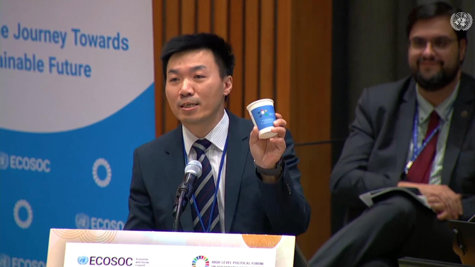 您那么真诚地邀请中国英德英九庄园易振华董事长参加第二届“世界可持续发展论坛”,让他们展示振兴乡村消灭贫穷的案例,但因为疫情,他们无法前往参会。为了落实您的遗愿,我跨越了三年疫情艰难时光与英德英九庄园合作,努力做一款环保茶来纪念您。我们经过了种种挫败,终于在2024年研发出一款采用100%降解材料制作茶杯,并可多次续水的提升人们健康的杯茶,我们命名为“帕乔里茶”。2025年7月23日,IMCC驻纽约首席代表蔡斌博士代表我在联合国可持续发展高级别政治论坛部长级会议的一般性辩论中向与会者介绍了“帕乔里茶”,得到了大家的赞美。