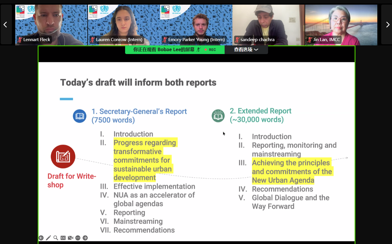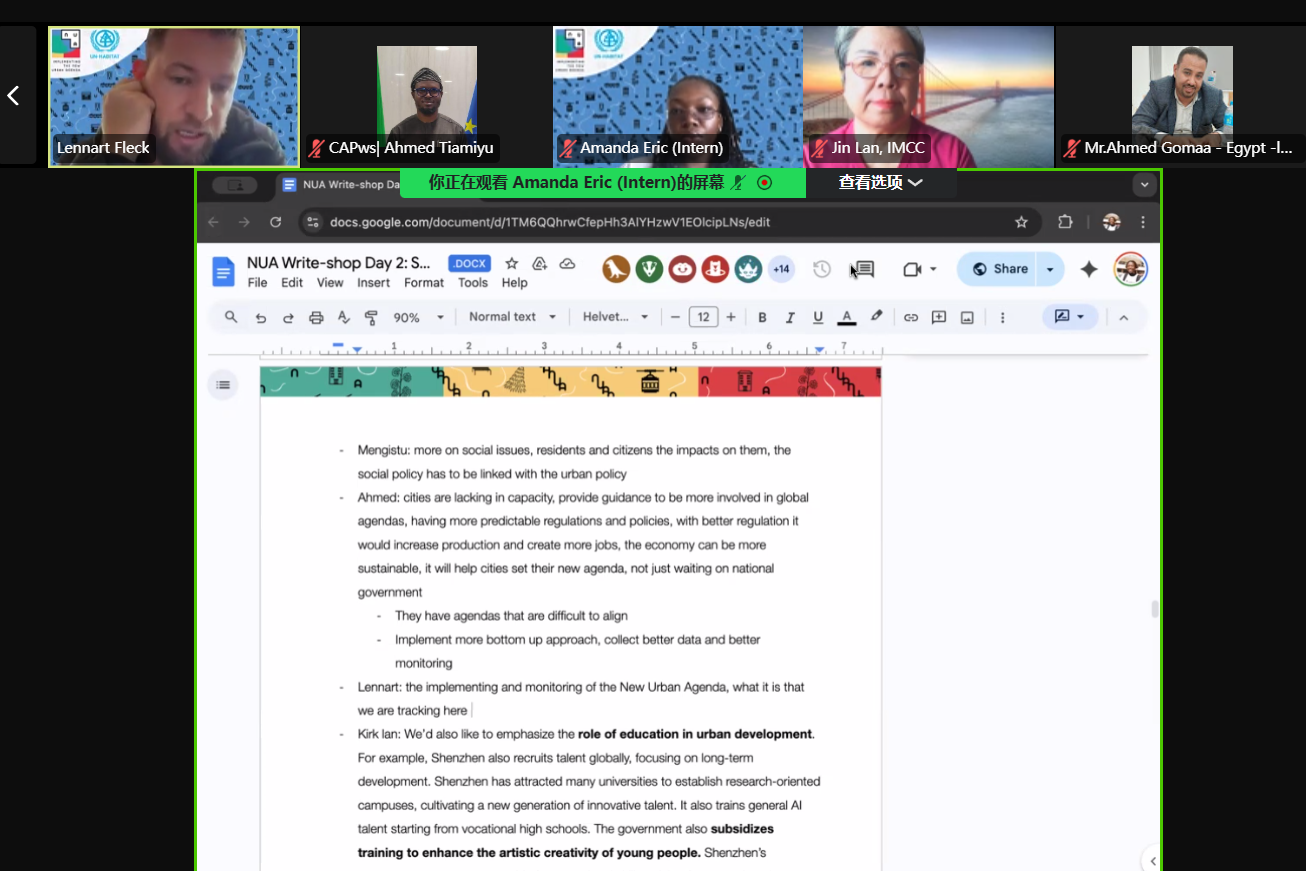 11月10日至13日,联合国人类住区规划署(联合国人居署)在线召开《新城市议程》执行进展报告编写讨论会,征求对报告部分内容的意见。国际市长交流中心团队在会上介绍了中国城市深圳的包容创新实践,并建议报告让发展中国家更多地借鉴深圳的城市治理模式。全体会议和分组讨论主持人对国际市长交流中心的积极参与表示感谢。此次参会,凸显了国际市长交流中心在全球城市监测、报告以及议程制定中的发言权。