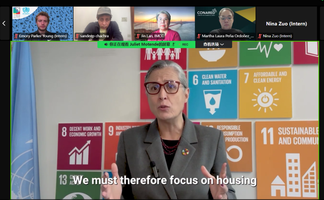 联合国副秘书长兼联合国人居署执行主任阿纳克劳迪娅•罗斯巴赫在会上发表视频致辞。画面顶部左三为国际市长交流中心创始人、开放式绿色城市实验室第二任理事长金兰。